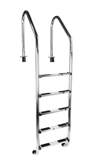 Лестница забортная для бассейна SL-515 — предназначена для комфортного и безопасного спуска в бассейн. Лестница состоит из трех ступеней изготовленых из полированной нержавеющей стали марки AISI-304. Поручни также изготовленных из нержавеющей стали. Они крепятся к борту при помощи — пластиковых стаканов (для бетонных бассейнов) или фланцев. Нижняя часть лестницы просто упирается в стену бассейна. Ступени крепятся к поручням с помощью болтов. Лестница SL-515 сделана для полностью заглубленных бассейнов с узким бортом. В комплекте поставляются крепежные элементы.